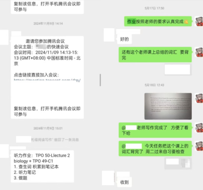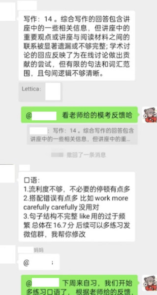 在整个学习过程中,T同学的父母和海拓始终保持沟通。妈妈会提醒同学查看老师的反馈,助教则每天检查词汇打卡情况。