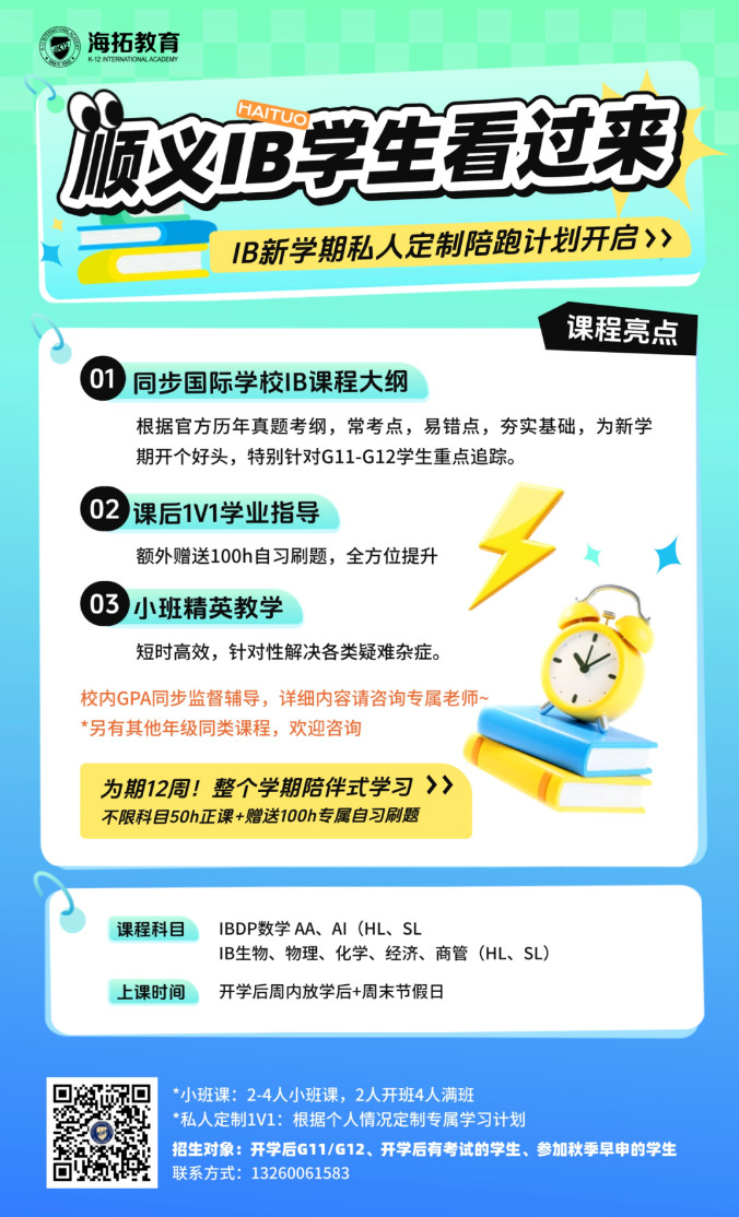 海拓「IB新学期私人定制陪跑计划」正式开启!海拓深谙IB课程体系的内在逻辑与评估要求,以分段支持、长线陪伴为理念,为各阶段的IB学子提供针对性帮助,让我们陪伴孩子,在新学期跑得更稳、更远!