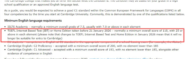 根据剑桥大学官方公告,只有2025年12月31日及之前考取的托福成绩(包括家庭版)才被认可,且需要满足总分不低于110分、单项不低于25分。而2026年1月1日起,所有新版托福考试成绩将不再适用于剑桥大学本科课程的申请。