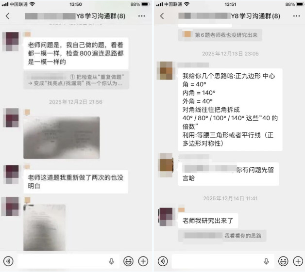 备考后期,她甚至能主动规划自己的学习,在群里和老师探讨解题思路,指出自己卡在了哪里、需要什么帮助。